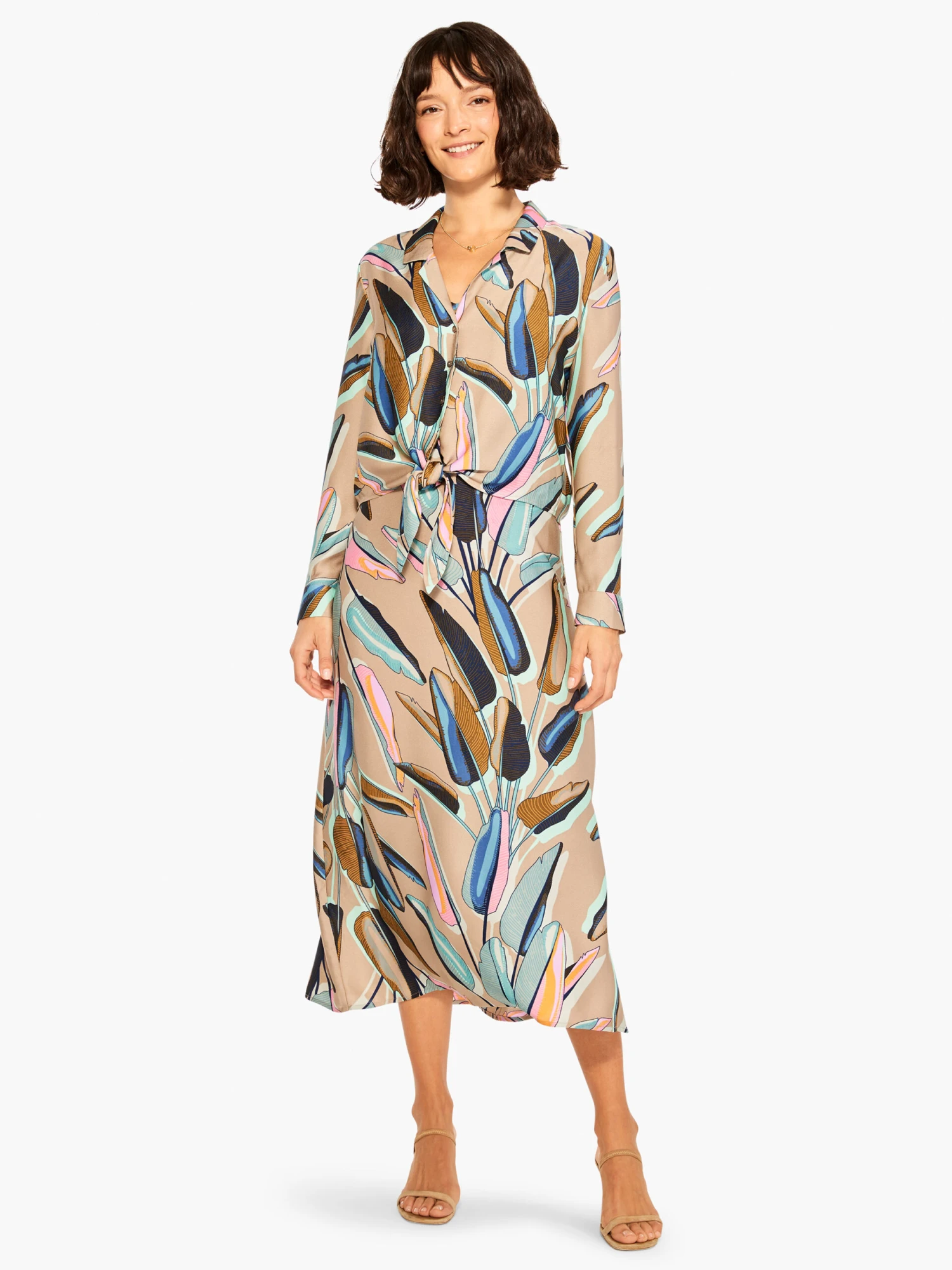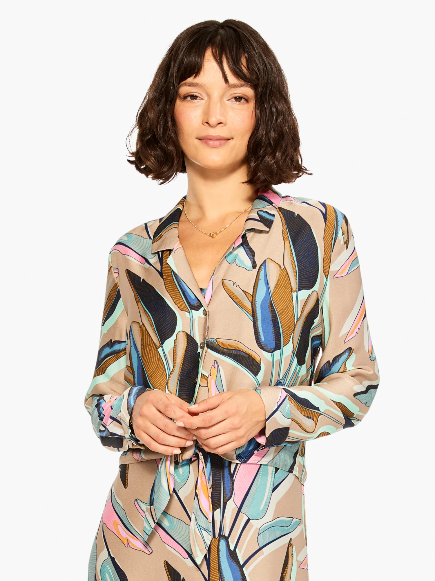 Made from our drapey and super soft Satin Chiffon fabric, we love this top’s ability to do it all: or at least match with just about everything thanks to its unique combination of neutrals and bright tropical shades. We love the cute knot detail that adds some textural pop. With long sleeves, a button front, and a stay flat shirt collar.