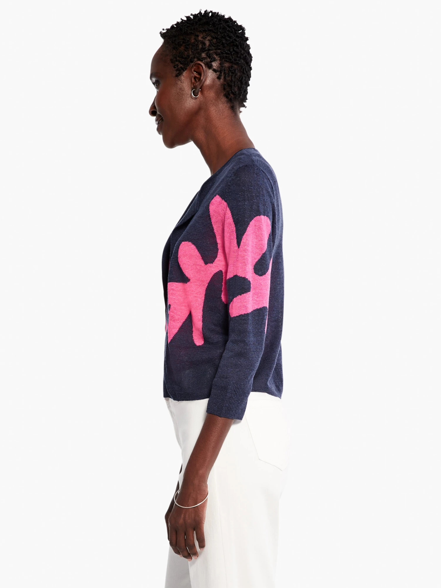 Sometimes a single big decision can make your look, and that’s the case with this easy cardigan. The leaf motif adds splash of color while the open front silhouette is all-day comfortable. Made from a cozy yet deliciously breathable linen blend. Mindfully Made from fully fashioned knitwear that eliminates textile waste. With 3/4 sleeves and designed to sit at the hip.