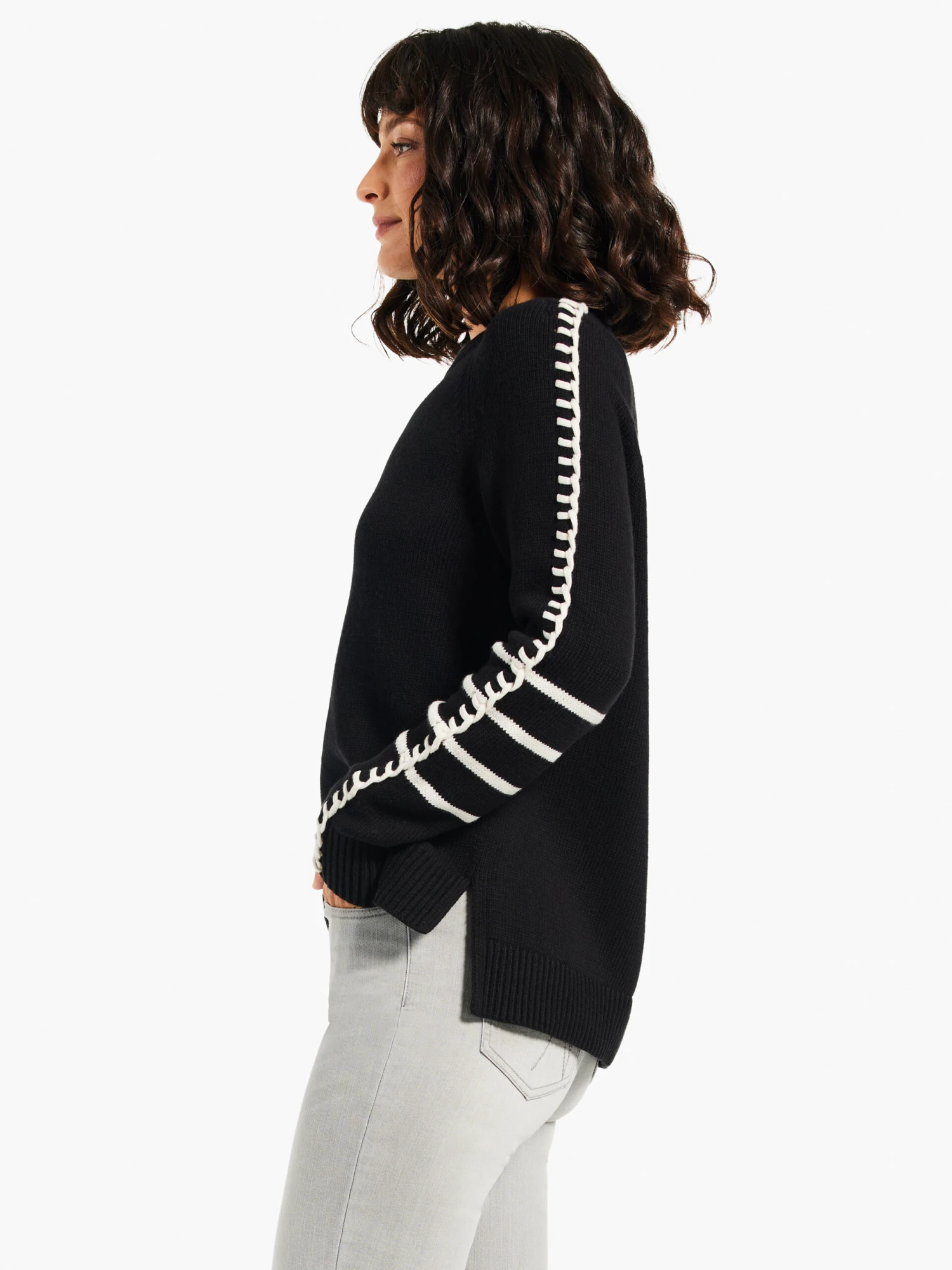 Everyone needs a black pullover, but this one adds a little extra to the everyday look thanks to the whipstitch detailing up the sleeves, and placed white stripes on the cuff. Made from a plied-up version of our super soft Zephyr yarn for a comfy, effortless feel. We gave it an easy fit, a round neck, and raglan sleeve to create a more feminine shape. The hi/low hem sits at the hip and offers extra coverage in the back.