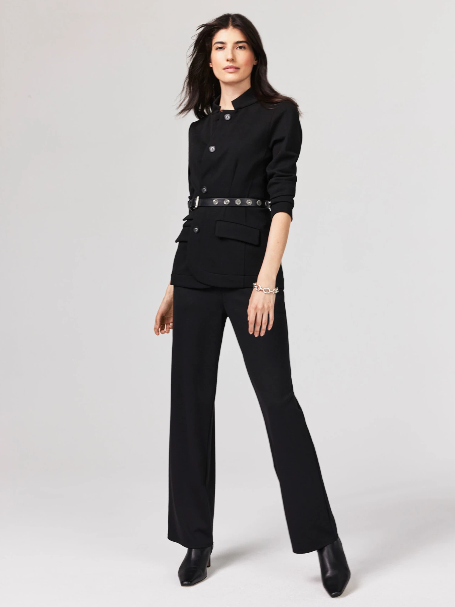 A fashion jacket that’s as comfortable as your favorite top? It is possible. This cosmopolitan blazer features buttons all the way to the top, and an on trend stand collar in addition to its surprisingly drapey soft feel. Details include the smart button front, asymmetric flap pockets, and a smart short hem that sits at the hip.
