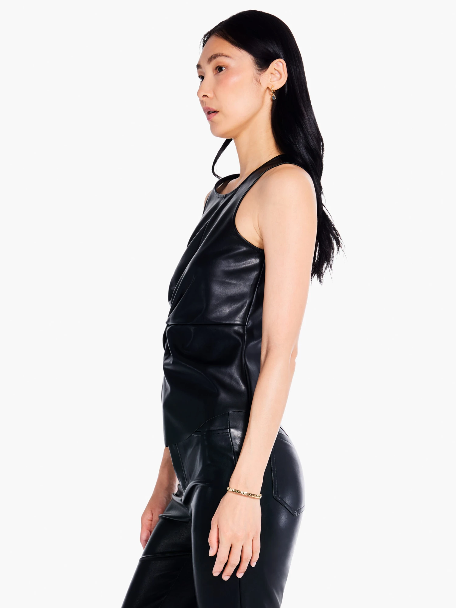 On trend and in style, with just a bit of a twist…This vegan leather twist front tank adds a sophisticated, cosmopolitan sensibility to your any ensemble. We’re wearing ours under a blazer, jacket, or open cardigan. In addition to the head-turning looks, the midweight feel is surprisingly comfortable and stretchy. The hem sits at the hip.