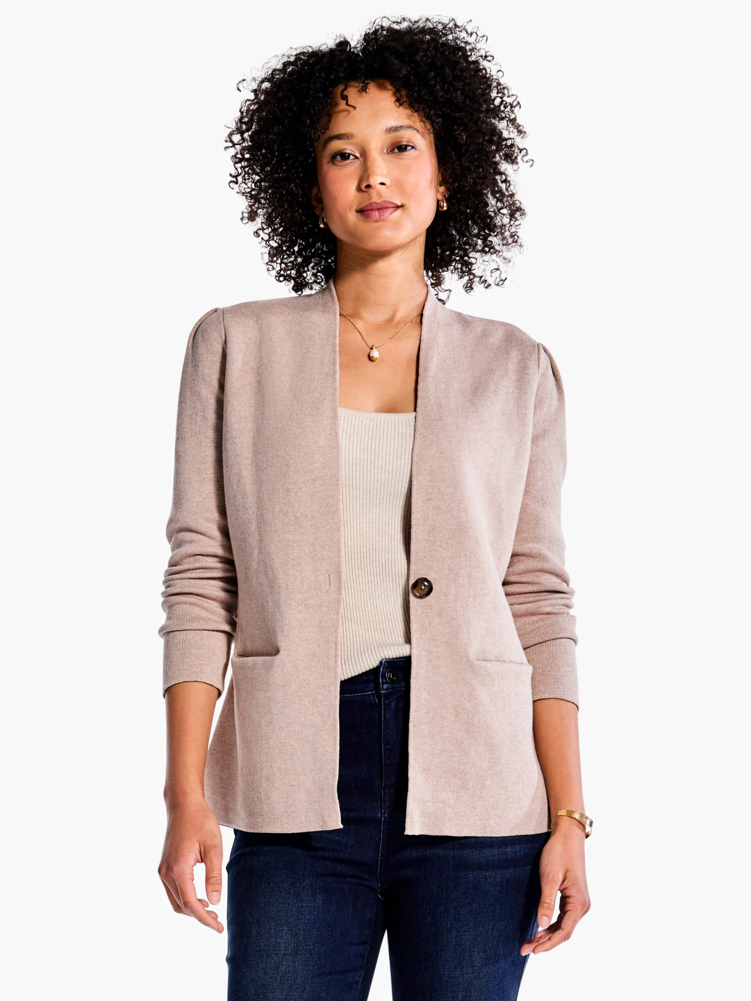 A timeless blazer silhouette that we’ve updated with some added femininity thanks to the pleat detail at the shoulder. The looks is completed with a shawl collar, long sleeves, single button front, and a hem that falls below the hip. Designed for a midweight feel and classic, regular fit. Goes great with denim!