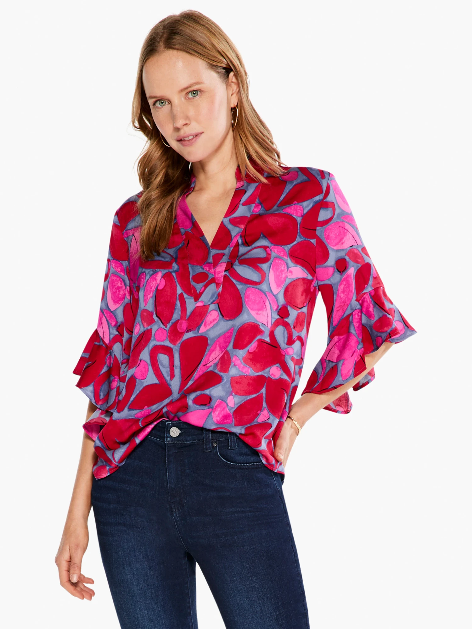A fun floral top designed to elevate any everyday outfit into something special. We gave it a hem that’s slightly longer in the back to give it some extra feminine shape. Pullover and always easy, with details like V-neck, stand collar, and flowy 3/4 bell sleeves with ruffling at the end. Sits slightly below the hip.