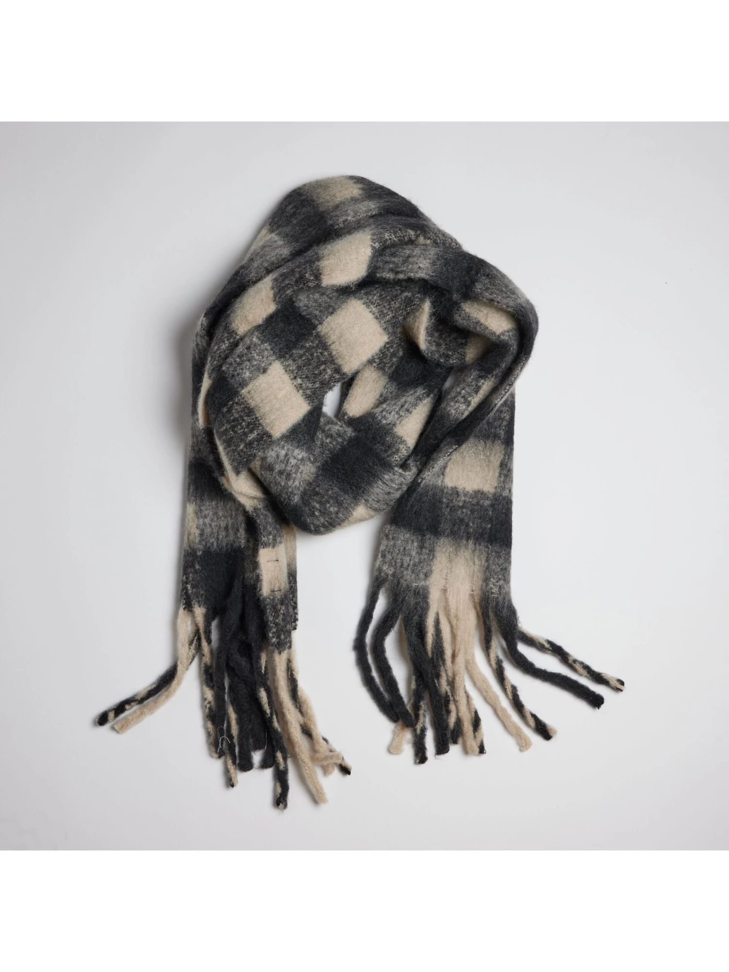 Make a statement in our large patterned Elle Plaid Scarf with fringe detail. A scarf that will keep you stylish while cozy all season long!