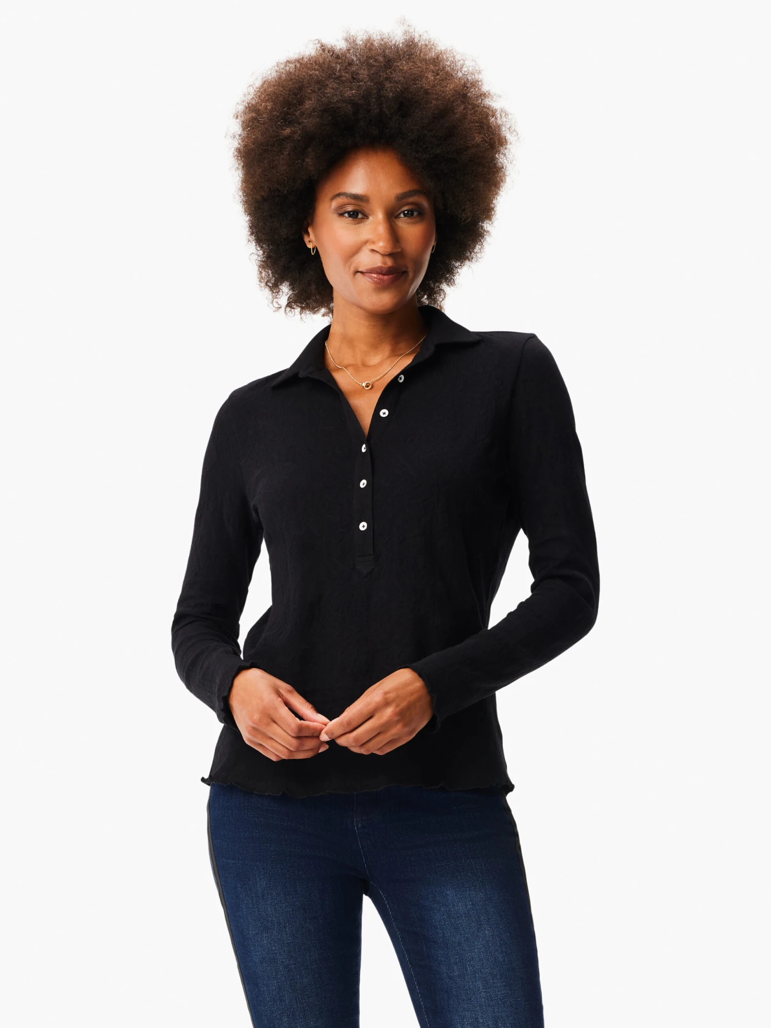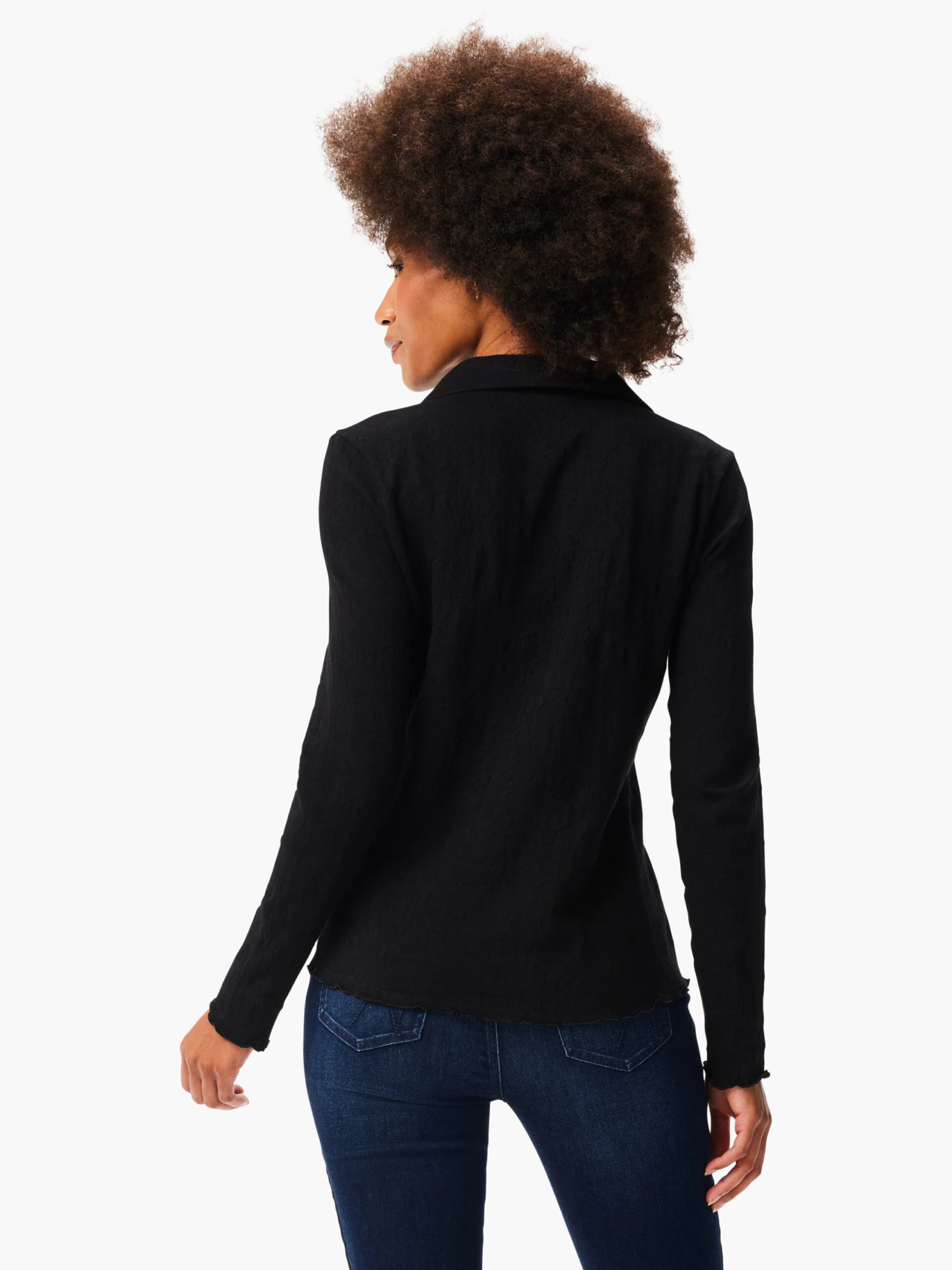 or when you’re looking to cultivate an intricate, elevated look in your everyday look. With long sleeves for more coverage and a hem that sits at the hip, the layering potential is almost endless.