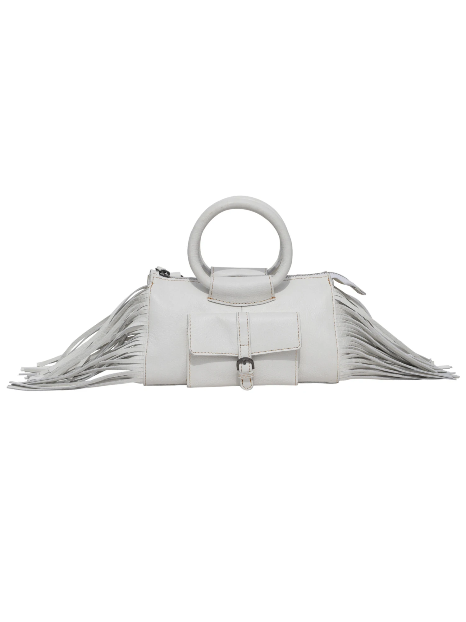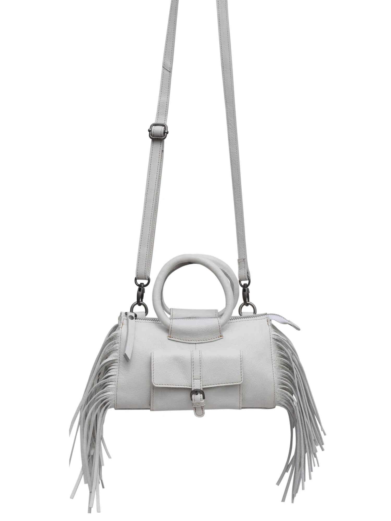 - Exterior fringe detail, flap pocket with magnetic snap closure