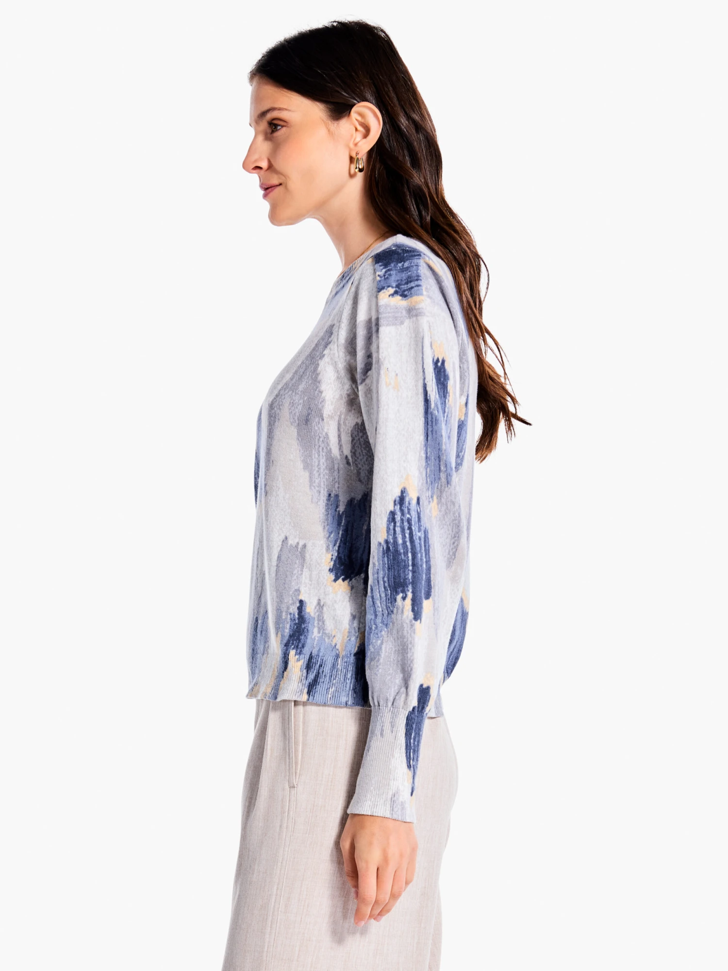 Our softest, drapiest sweater construction yet with an easy all-year pattern to match. The pattern features a blend of yellow and complementary blues and greys designed to go great with denim. With a crew neck, ribbed cuff, and a drapey hem that sits at the hip. Mindfully Made from fully-fashioned knitwear that creates next to zero fabric waste.