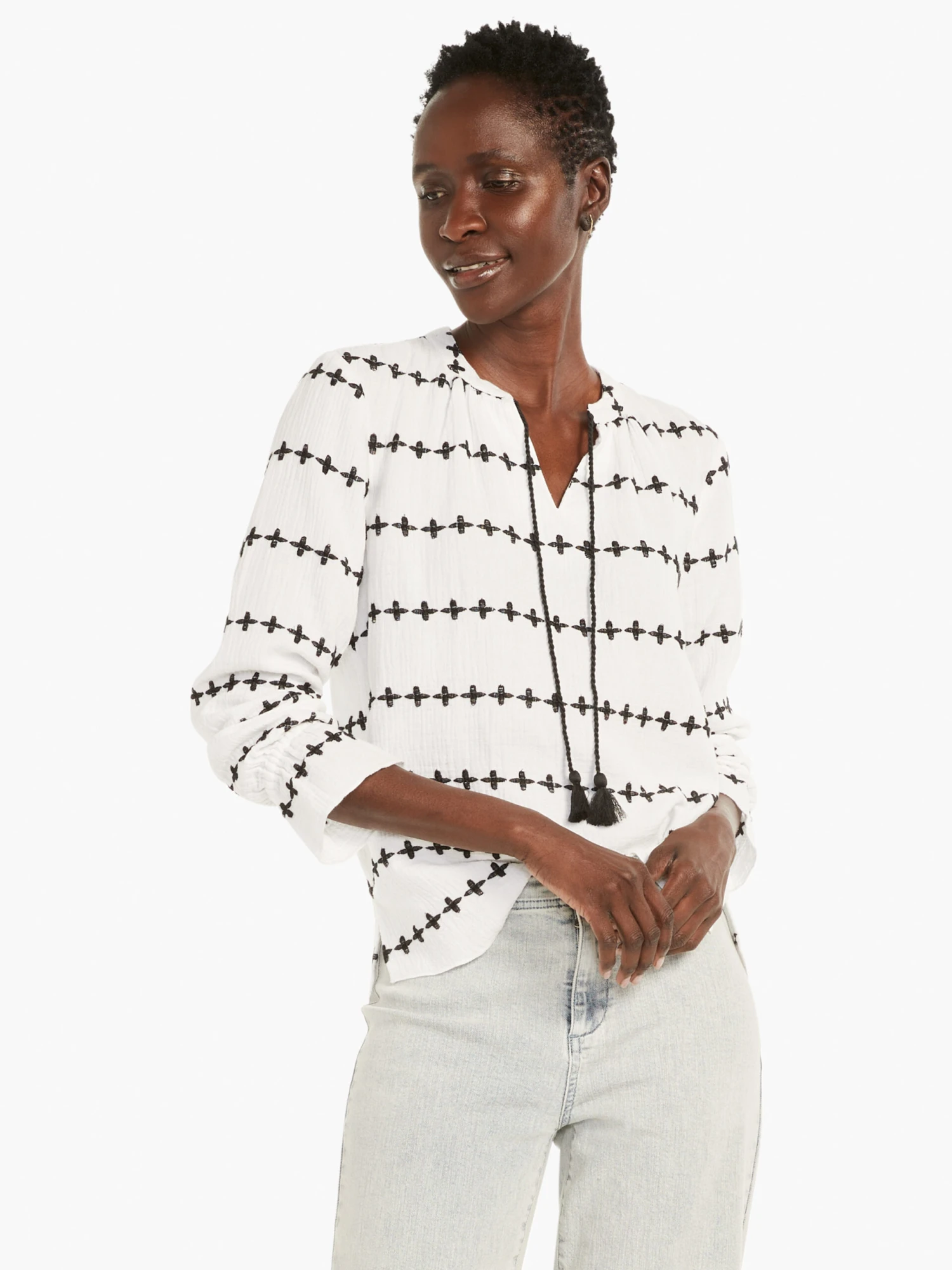 Our go-to pairing (or should we say date?) for any casual outfit. This sophisticated, yet simple picnic top to take your casual warm-weather days to the next level, with its chic embroidered plus design, band collar, and fun tassels. A relaxed fit with a V-neck and long sleeves that feature elastic cuffs for even more ease. Designed to sit at the hip.