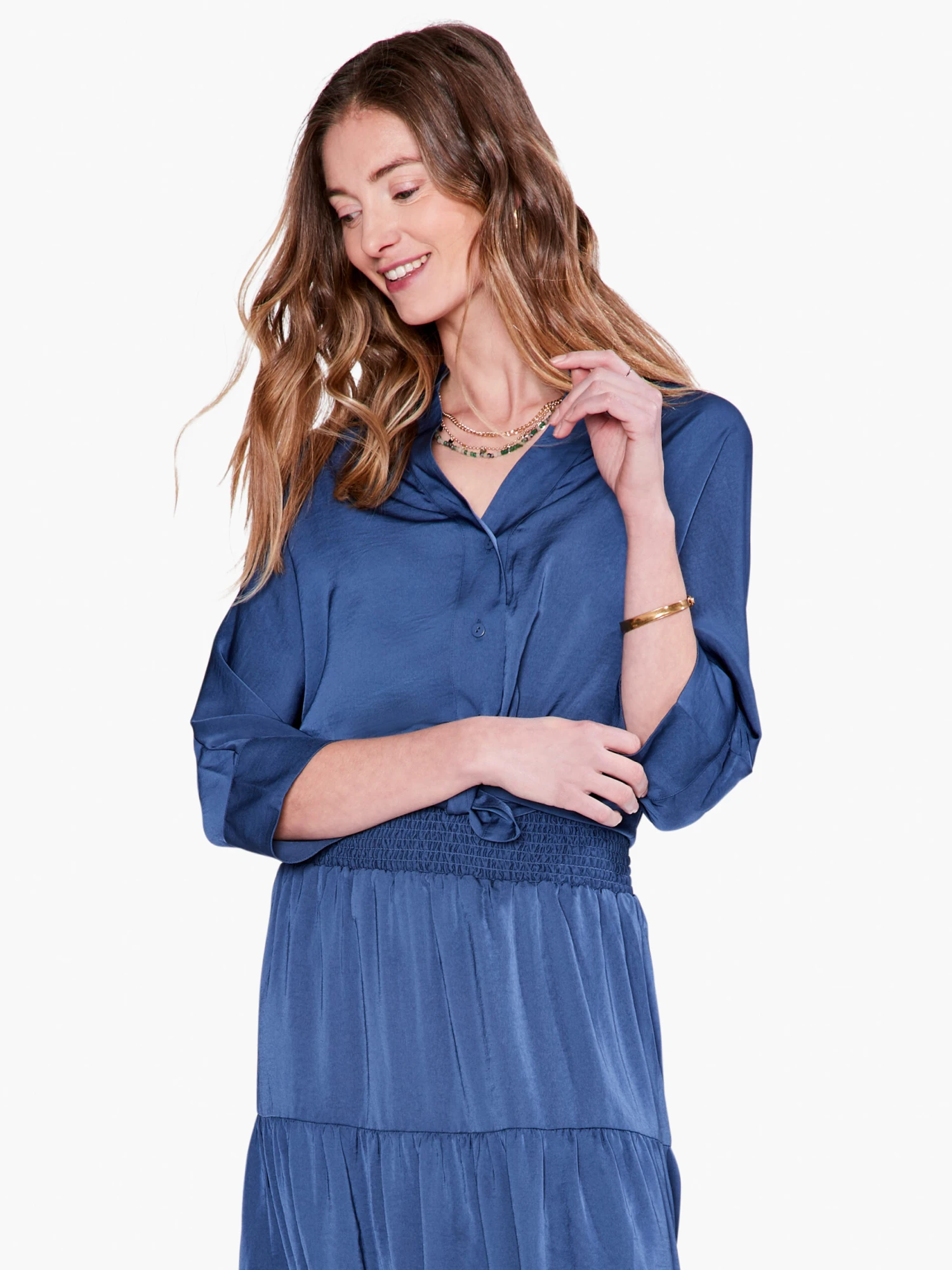 A beautifully deep blue top full of delicious details and soft, drapey feel you can’t stop touching. We love the stand collar, the 3/4 dolman sleeves, and the oversized cuffs that give it extra shape. With a button front that’s designed to sit slightly below the hip. Pair it with the matching skirt for a tonal head to toe look or make it the centerpiece of your own look. Mindfully Made from partially recycled materials.