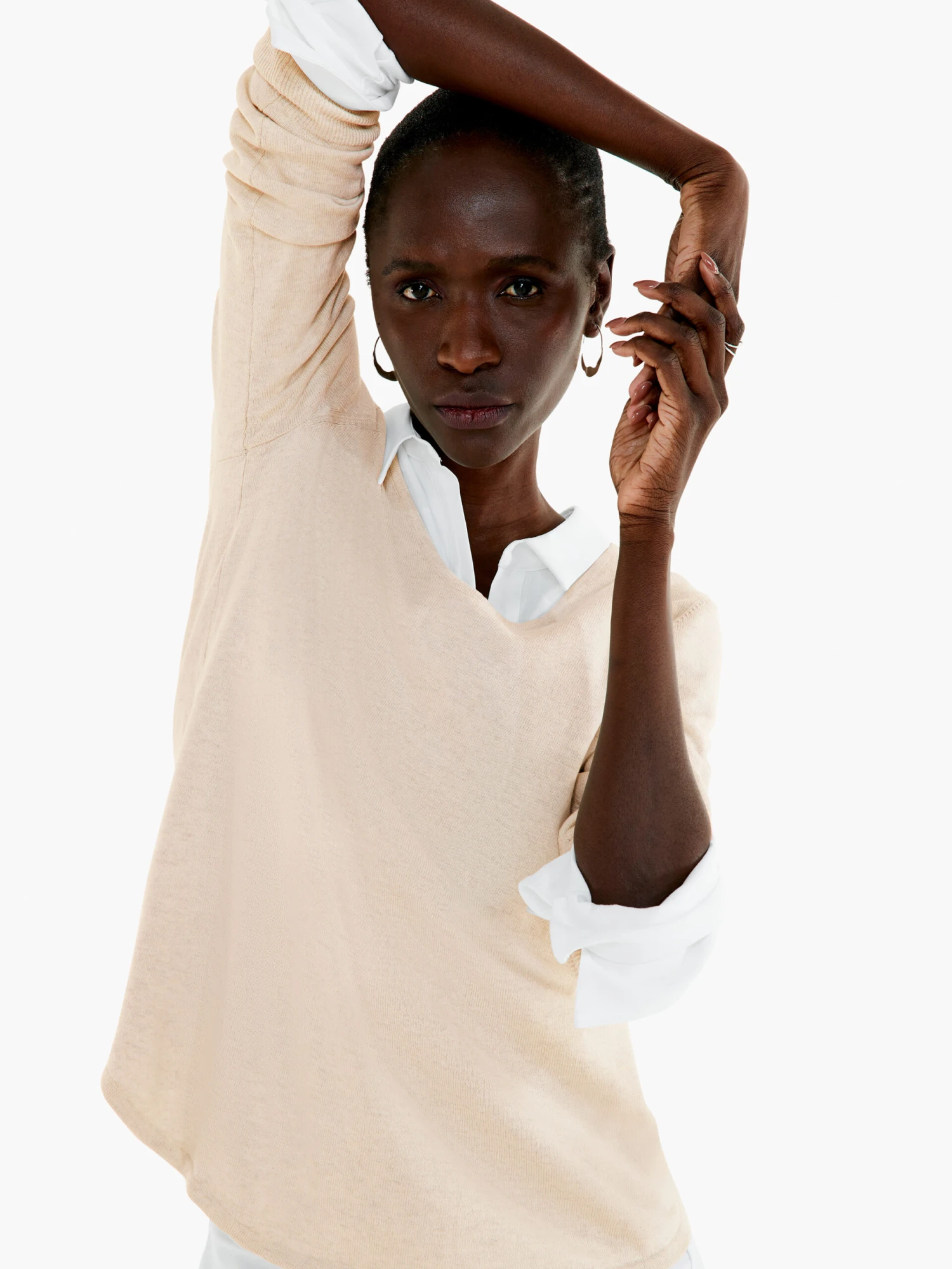 Vital. Classic. Essential. This is the perfect version of the classic V-neck sweater. Our signature lightweight knit offers unmatched comfort, breathability, and all-season versatility. As a top or as the quintessential layer and in fourteen colors (and counting!) it’s hard to stop at just one. A classic pullover and made with partially recycled materials, making it Mindfully Made!